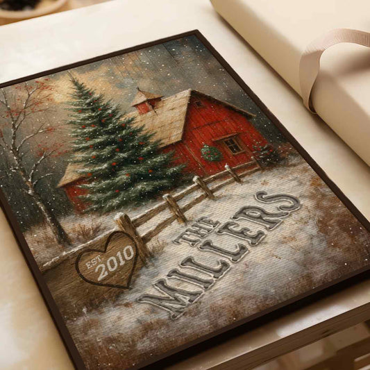 Red Barn Custom Family Name in the Christmas Snow Canvas