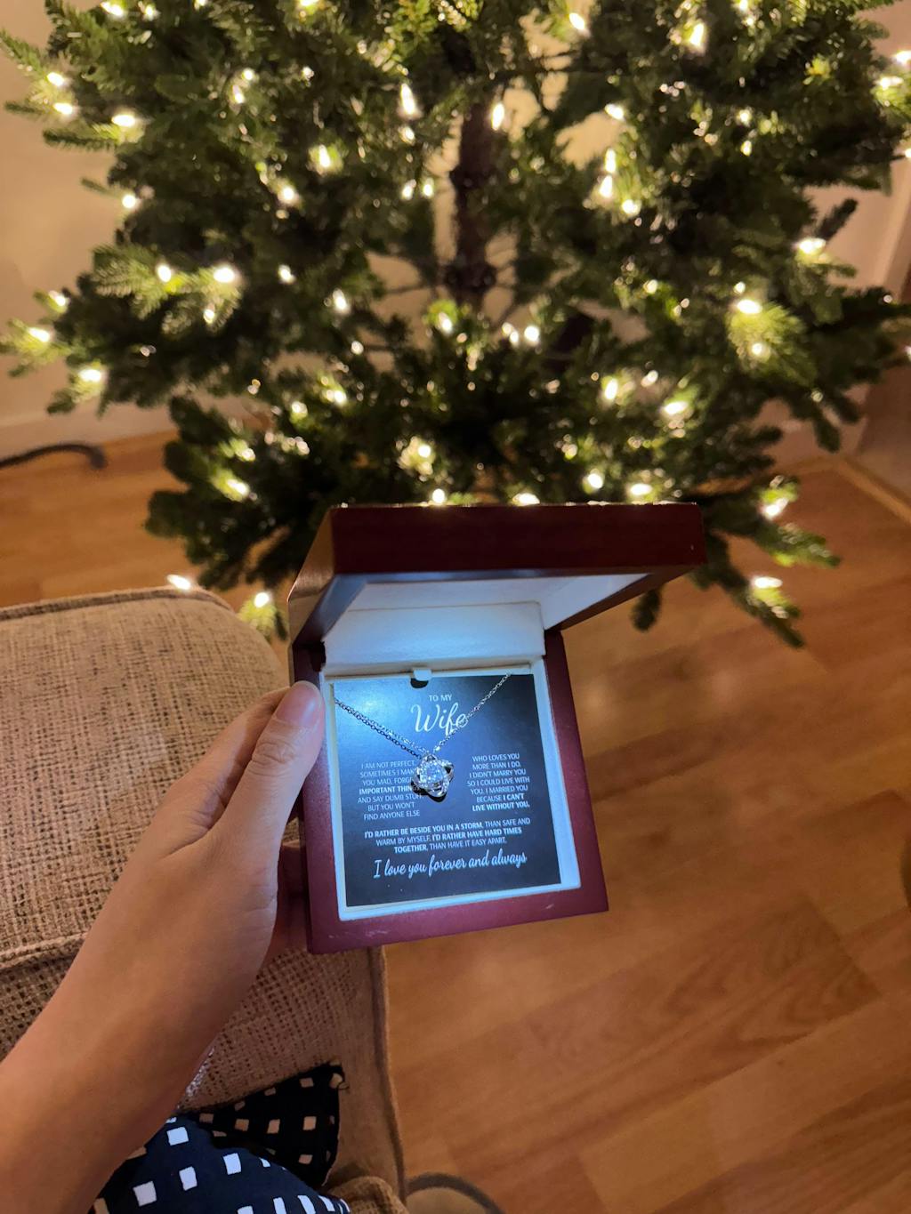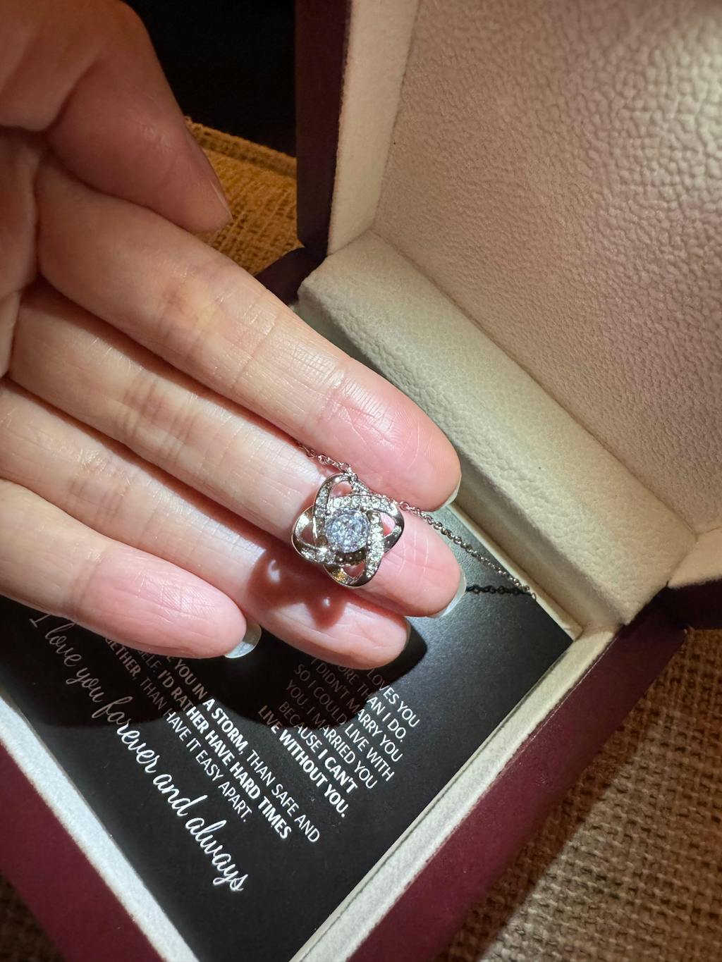 Luxury Gift Box: Mahogany box with built-in led spotlight that lights upon the necklace and the message card, making it more special.